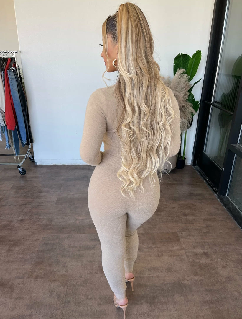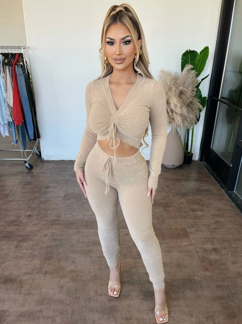 ~Matching set made from nice fuzzy material and has long sleeve top with pants for bottoms, Set has tie front detail and is great for a nice night out