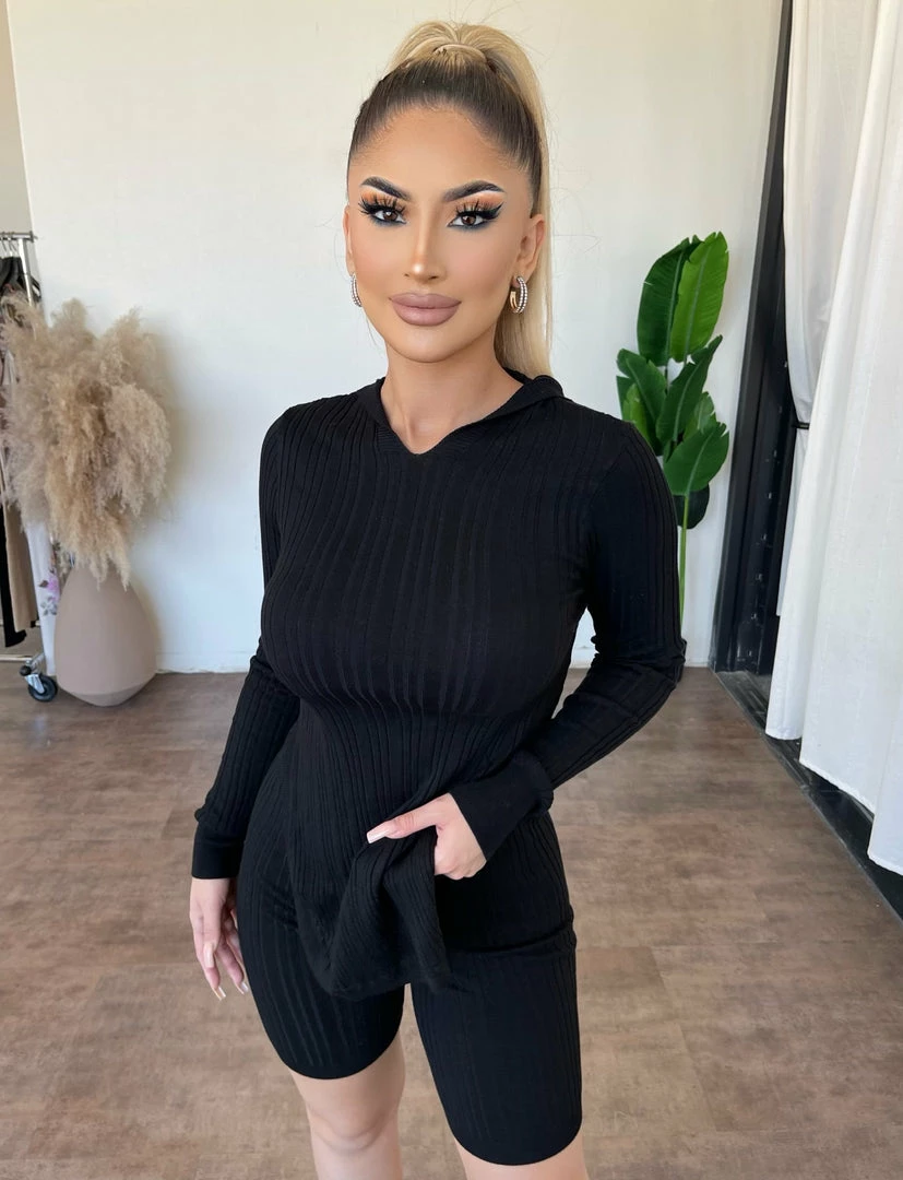~Set made from fitted ribbed material with hoodie and biker shorts for bottoms, Set goes great with heels or sneakers and perfect for many occasions