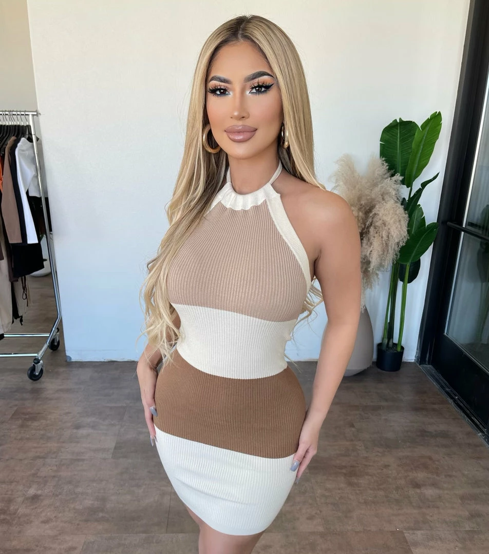 ~Halter dress made from a knit material with adjustable neck tie detail, the dress is perfect with many heels and great for many occasions like a nice day out