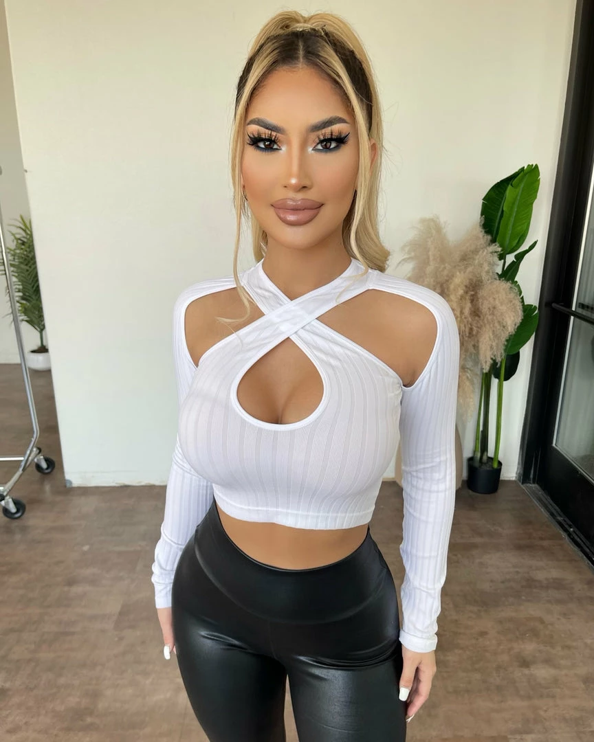 ~Long sleeve top made from fitted material with nice front faux halter design, Top goes great with high rise leather bottoms and perfect with a cropped jacket