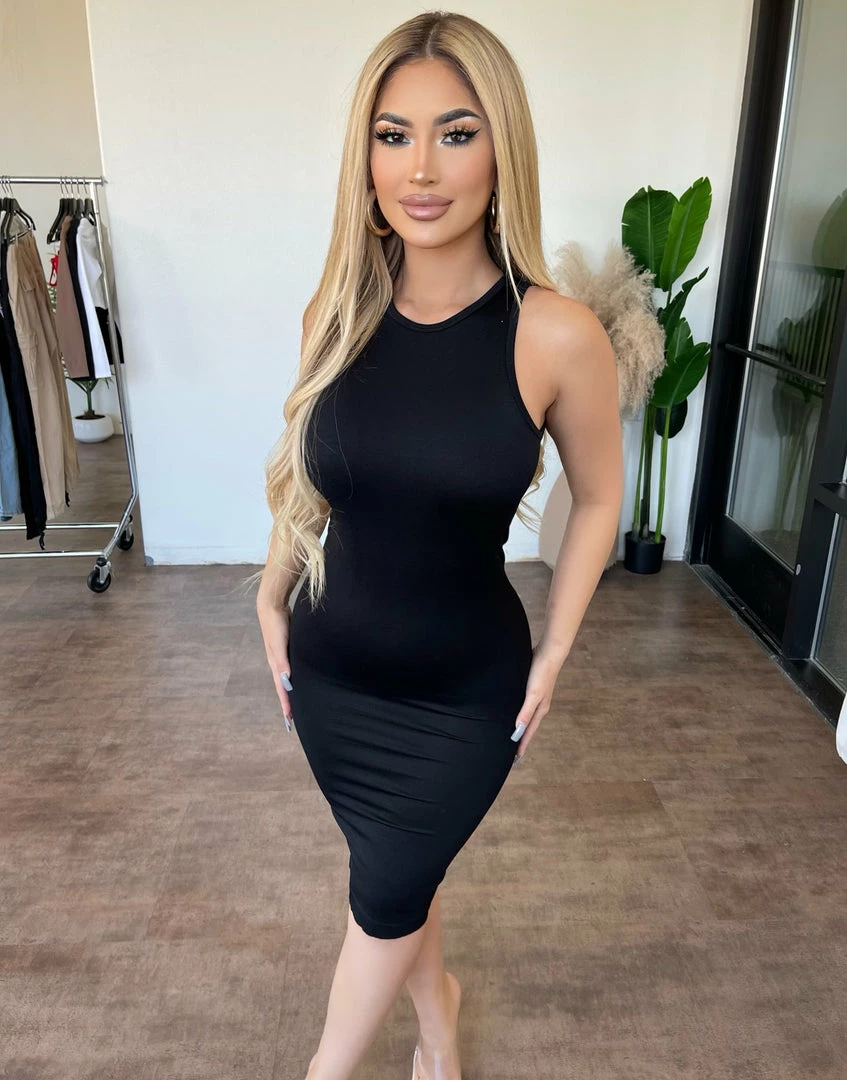 ~Dress made from nice ribbed material. The dress goes great with heels and is perfect with a nice cropped jacket