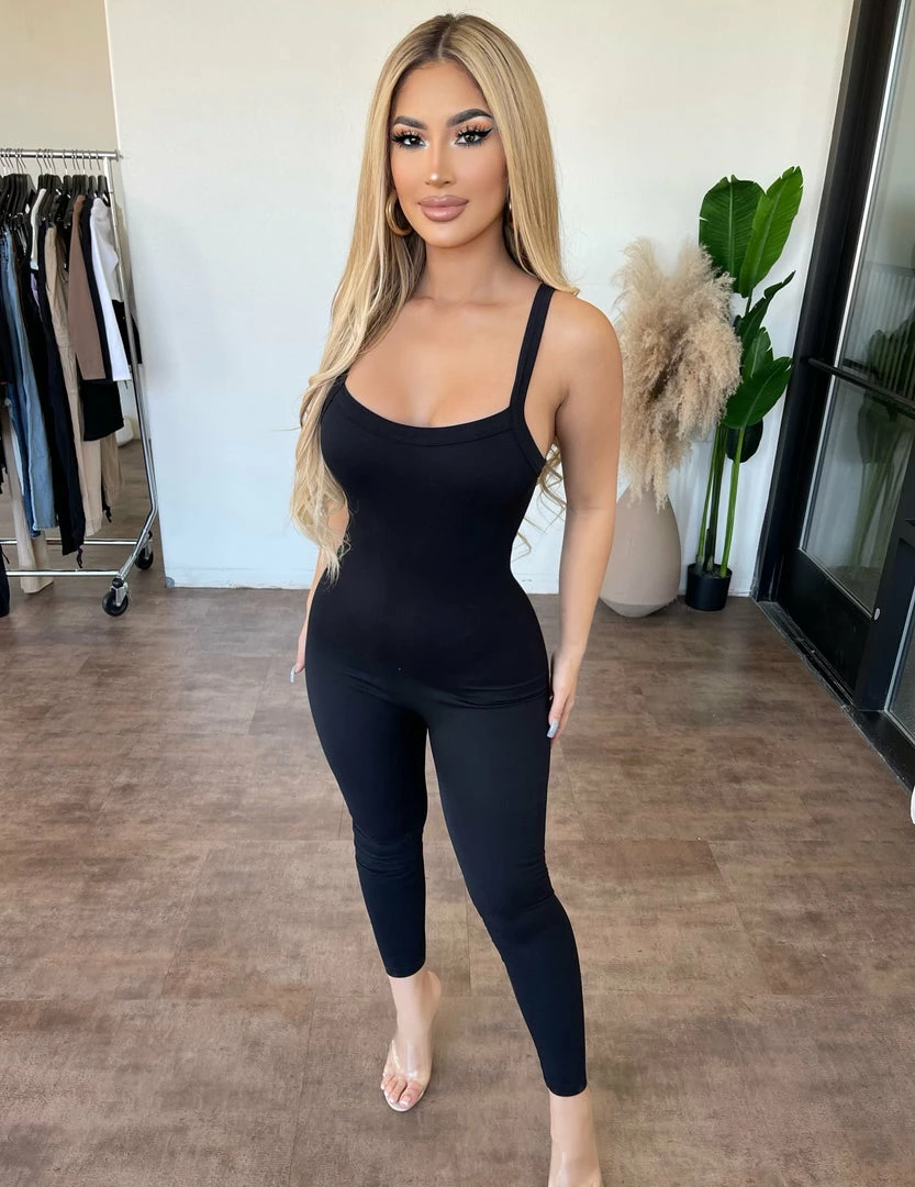 ~Jumpsuit made from fitted soft material, Jumpsuit goes great with a cropped denim distressed jacket and heelsÂ