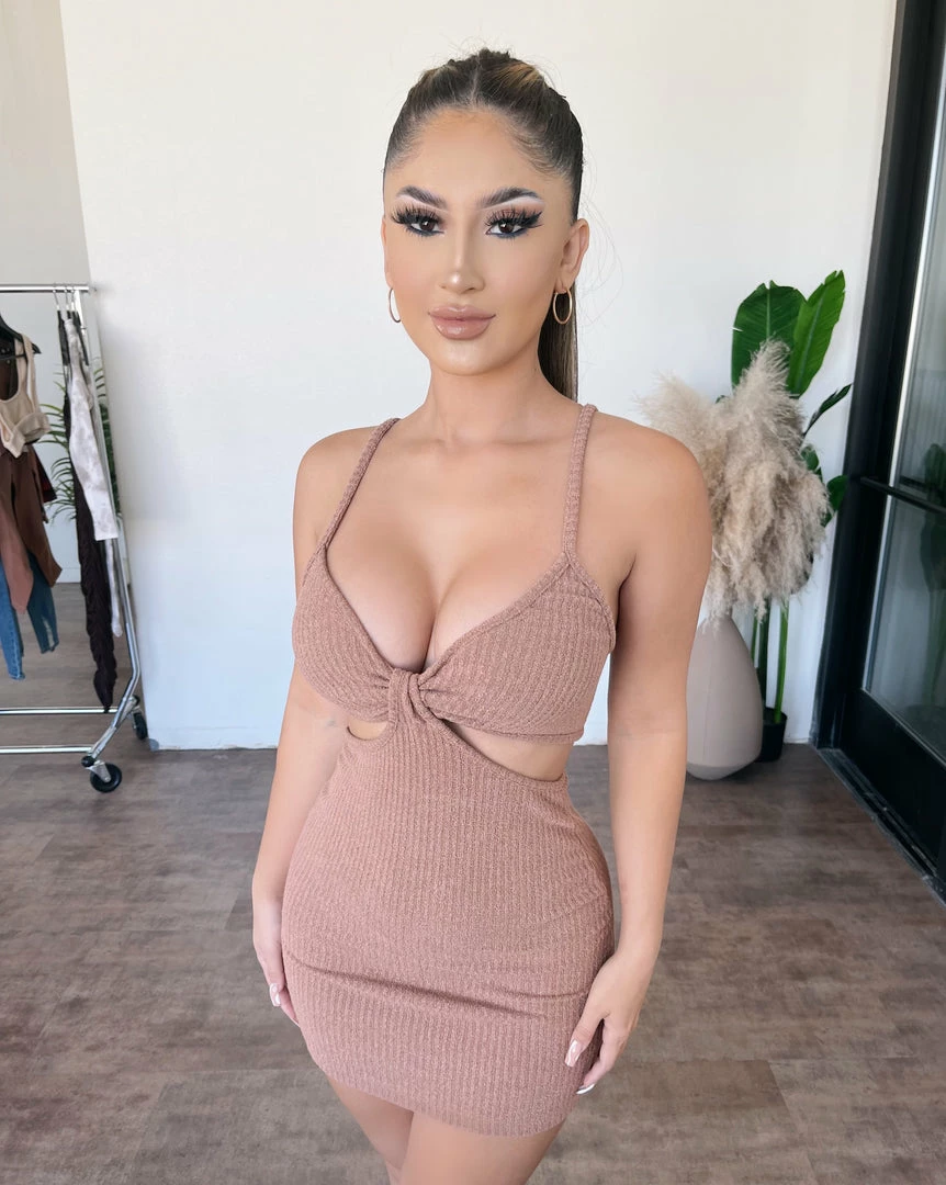 ~Dress made from a fitted soft ribbed material with side stomach open detail, Dress is great for a special night out and perfect with heelsÂ