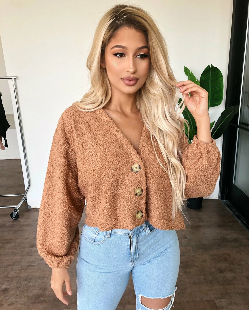 ~Top made from nice fuzzy material with front button detail, Top has a nice oversized fit and is great with high rise bottoms