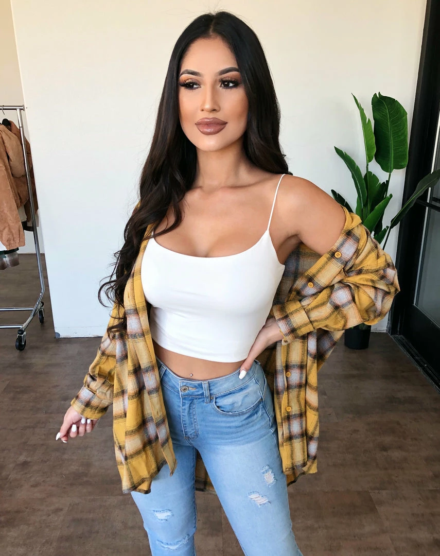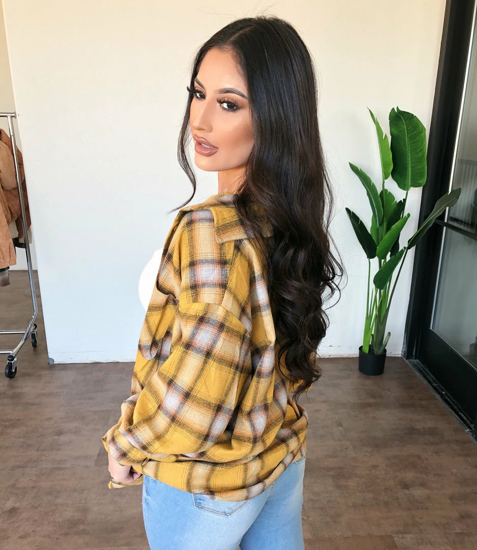~Flannel made from nice plaid material with adjustable front button detail, Top is great for many occasions and perfect with high rise denim bottoms