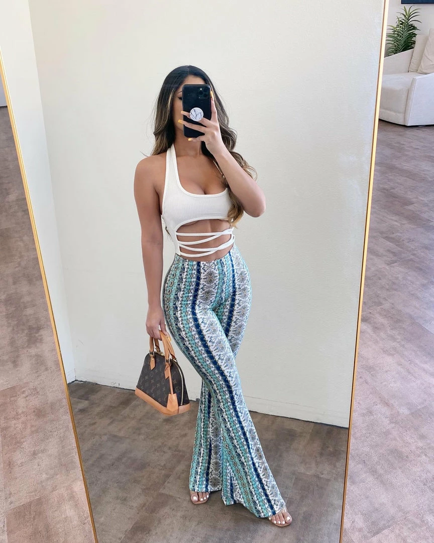 ~Nice bell bottoms with printed design that go perfect with many of out tops, Perfect for a nice day or night out
