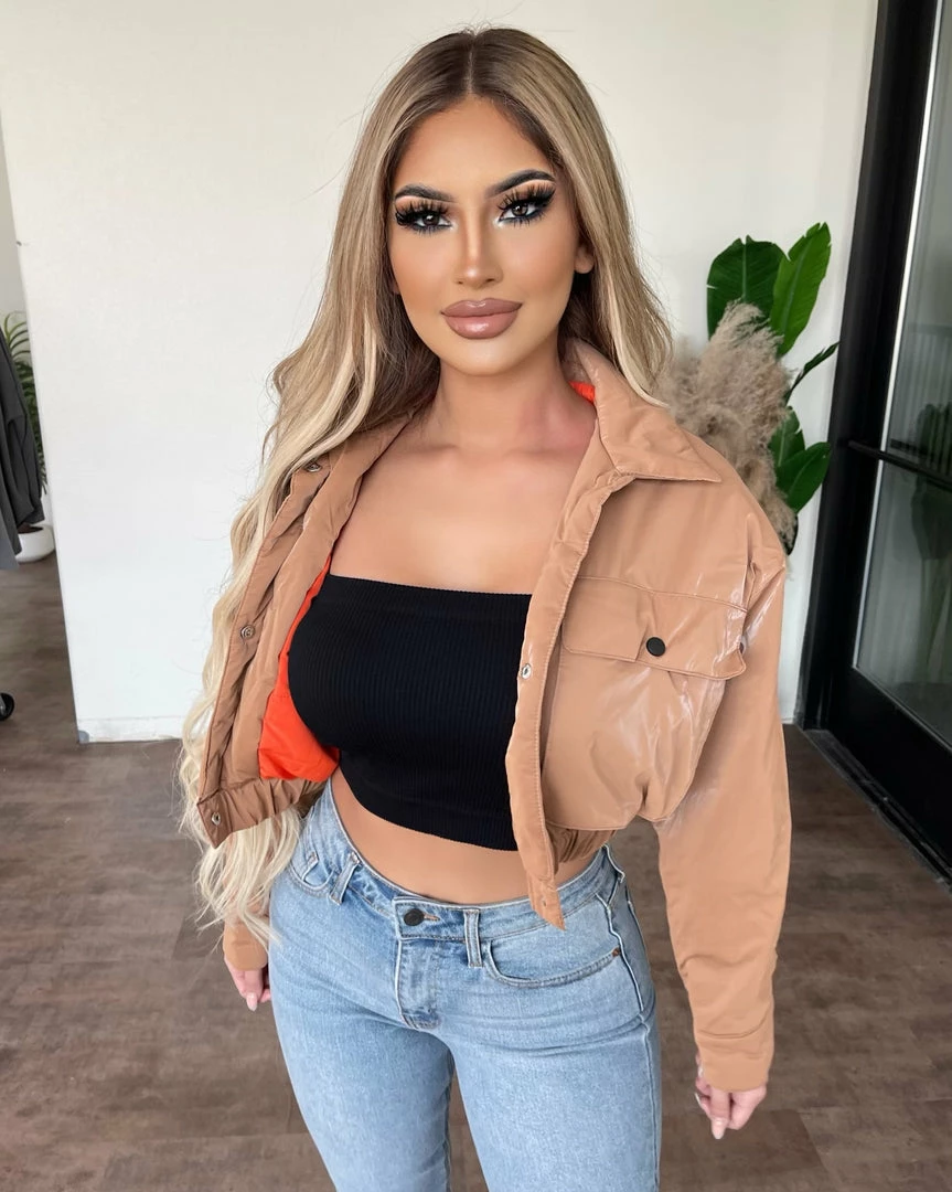 ~Bomber jacket made from nice puffy material and has adjustable front button detail, Jacket goes great with many outfits and perfect for cold weather