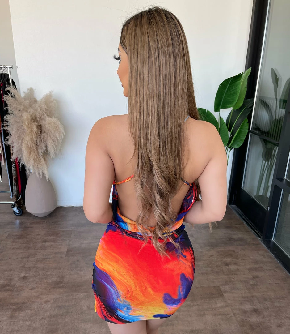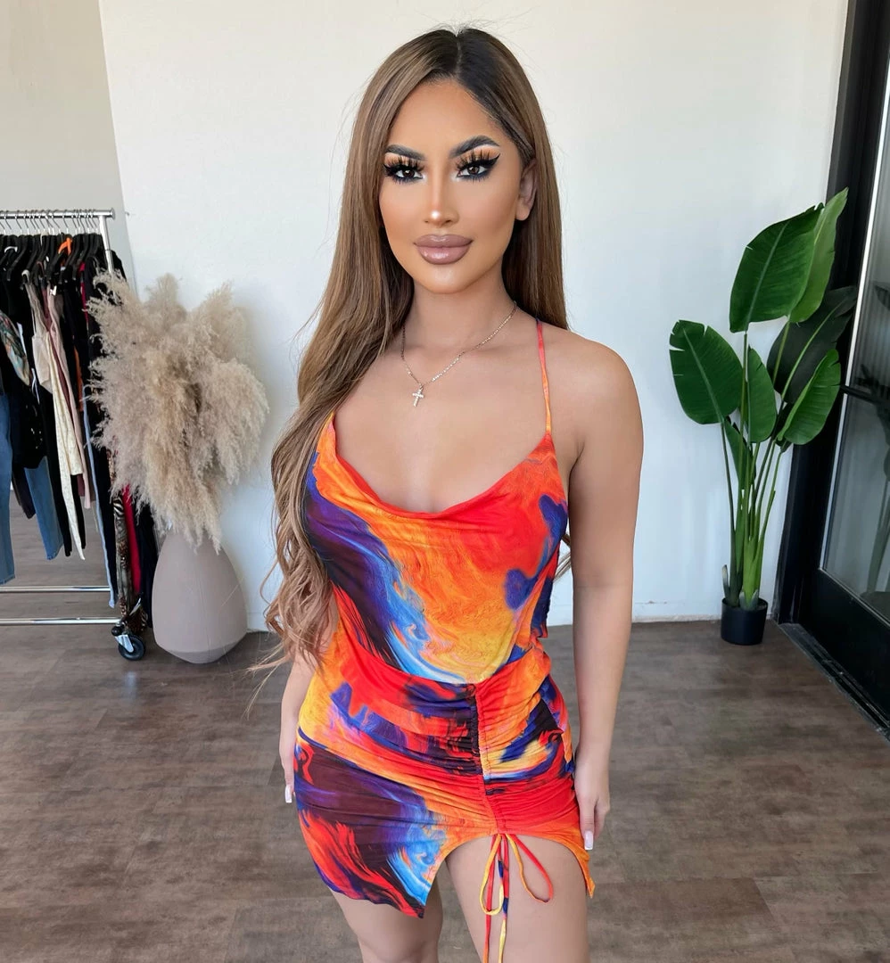 ~Dress made from nice soft printed material with adjustable front side scrunch detail, Dress goes great with a leather jacket and perfect with heels