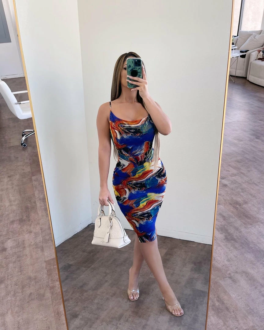 ~Dress made from nice fitted multi color printed material with adjustable cami straps, Dress goes great with many cropped sweaters and perfect for a nice special occasion