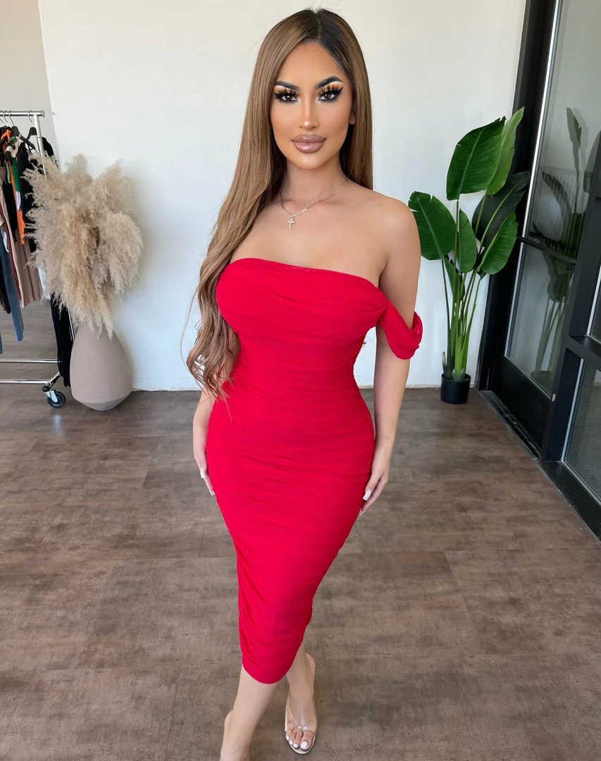 ~Off Shoulder dress made from fitted wavy mesh material, Dress goes great with a cropped jacket and perfect for a nice special occasions