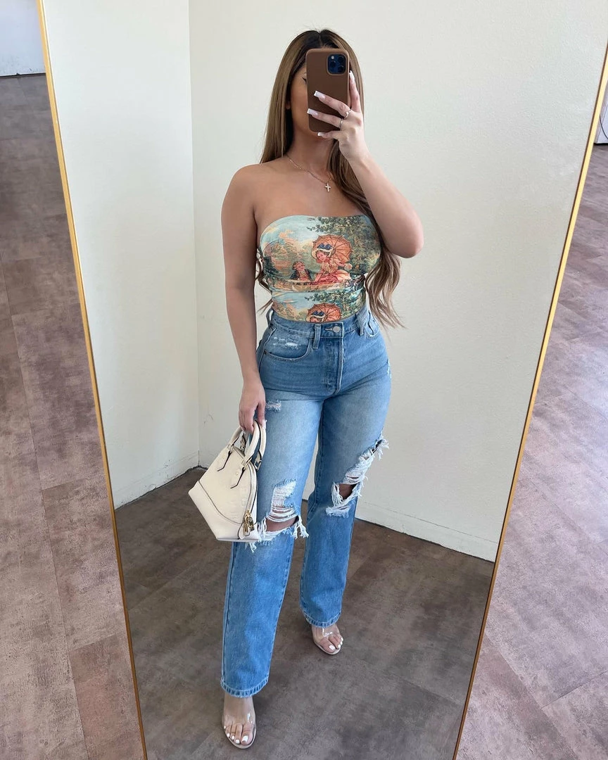 ~ Jeans made from a nice soft denim material with distressed and multiple fronts distressed open hole detail and go great with a cami top or bodysuit. Jeans have no stretch