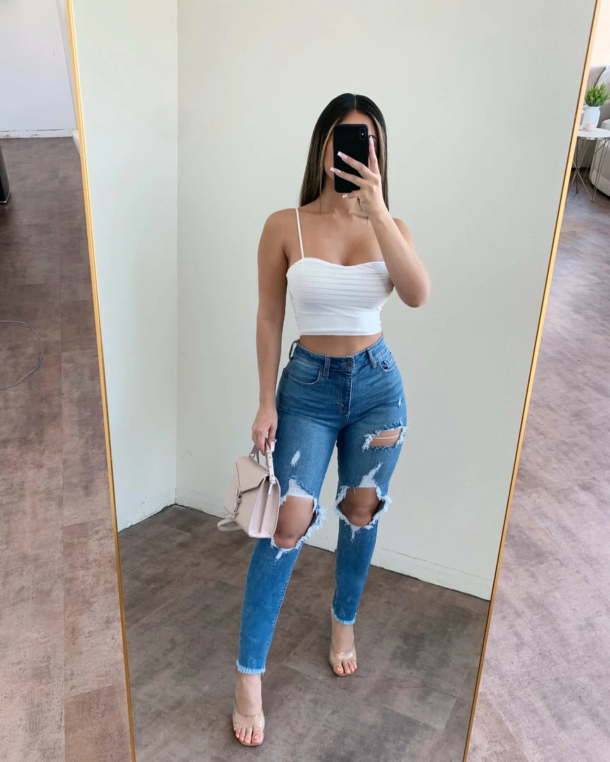~Denim jeans made from nice stretchy fitted material with multiple distressed slits on front of jeans, Long sleeve knot top goes great with these jeans