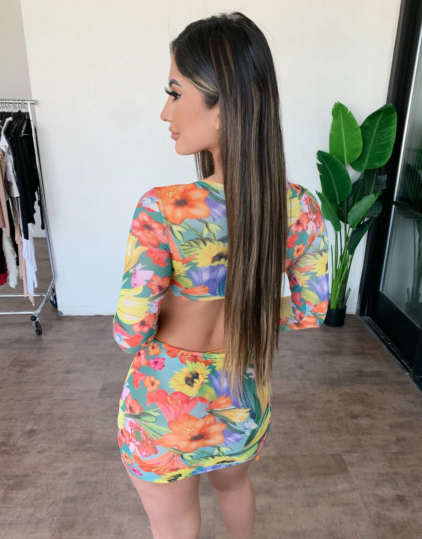 ~Bikini set made from floral print material with top skirt and bikini bottom, Top is an adjustable knot top and is great for this hot summer weather