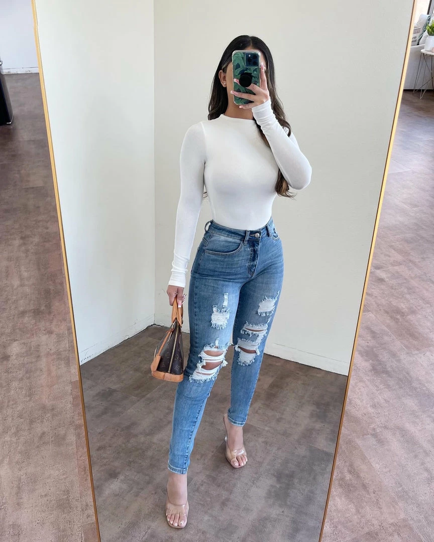 ~High rise jeans made from nice stretchy fitted material with distressed detail on the front of jeans, Jeans go great with many tops and perfect with heelsÂ