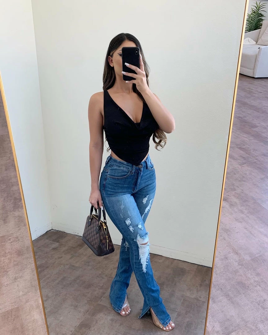 ~High rise jeans made from nice stretchy fitted material with distressed detail on the front of jeans, Jeans has nice slit detail on bottom ends of jeansÂ