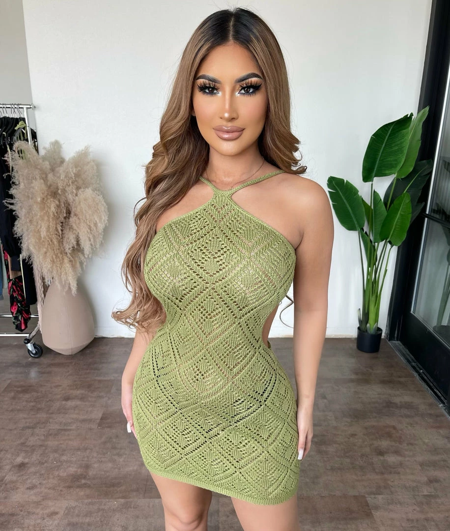 Crochet halter bodycon mini dress, gorgeous this summer.