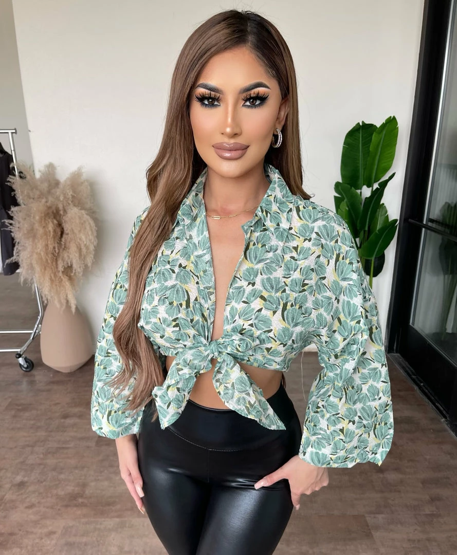 ~Long sleeve top made from printed material with adjustable front knot detail, Top goes great with high rise bottoms and perfect for a nice hot day outÂ