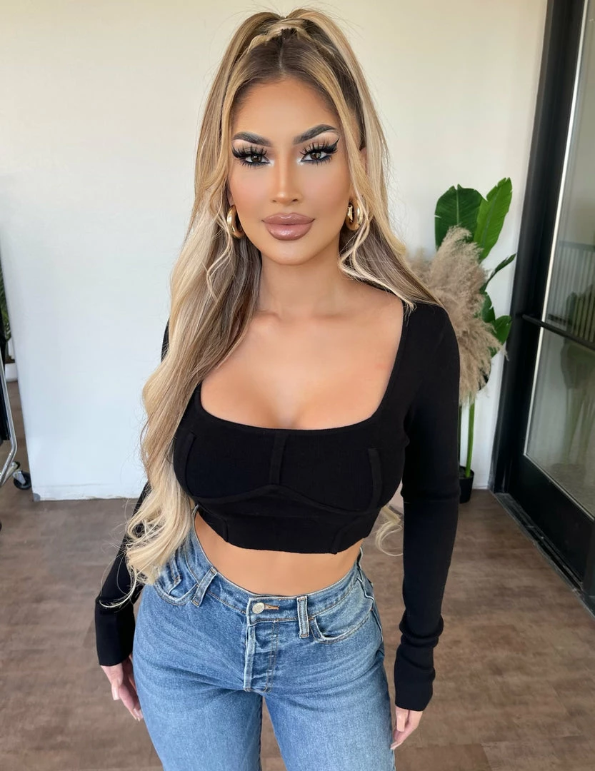 ~Long sleeve top made from a ribbed material with front square detail, Top is great for many occasions and perfect with many bottoms.