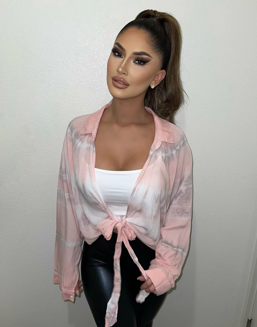~Long sleeve top with adjustable front knot detail and also has collar detail, Top also has adjustable front button detail and perfect with a lace bralette top