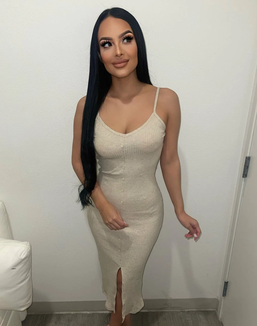 ~Cami dress made from nice ribbed material with faux front button detail, Dress is great for the beach and perfect with heels and cropped denim jacket