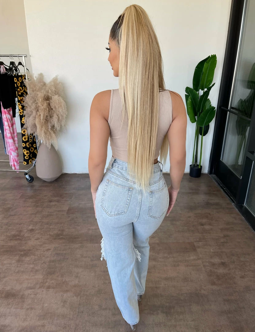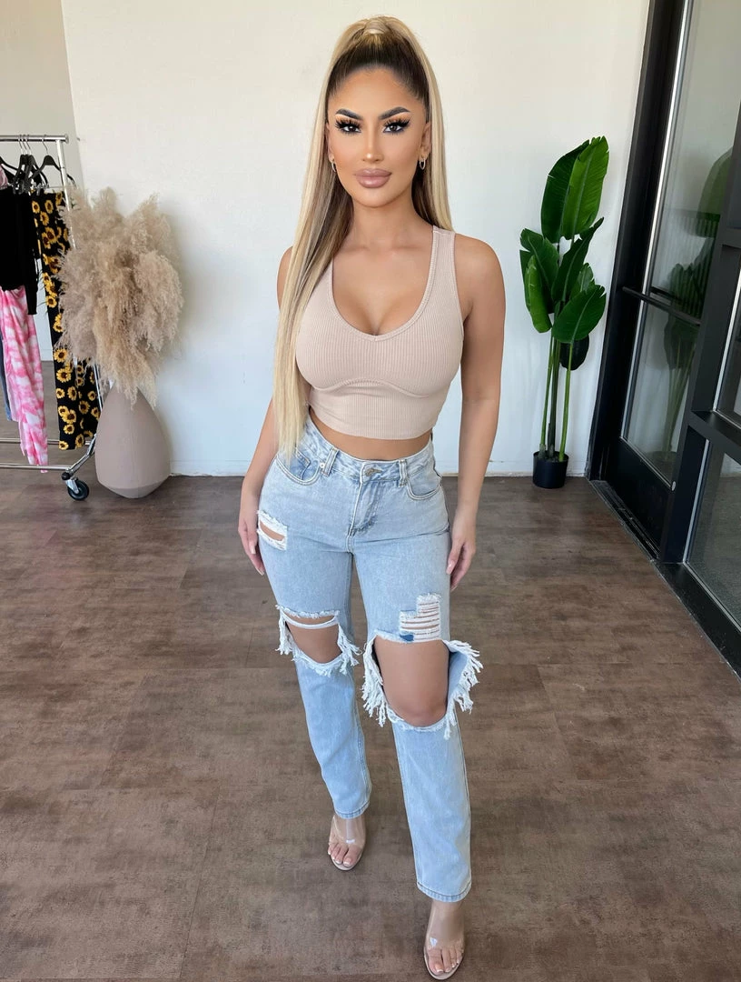 ~Jeans with no stretch and multiple distressed details on both front legs of jeans, Jeans are great for many occasions and perfect with many of our cropped tops