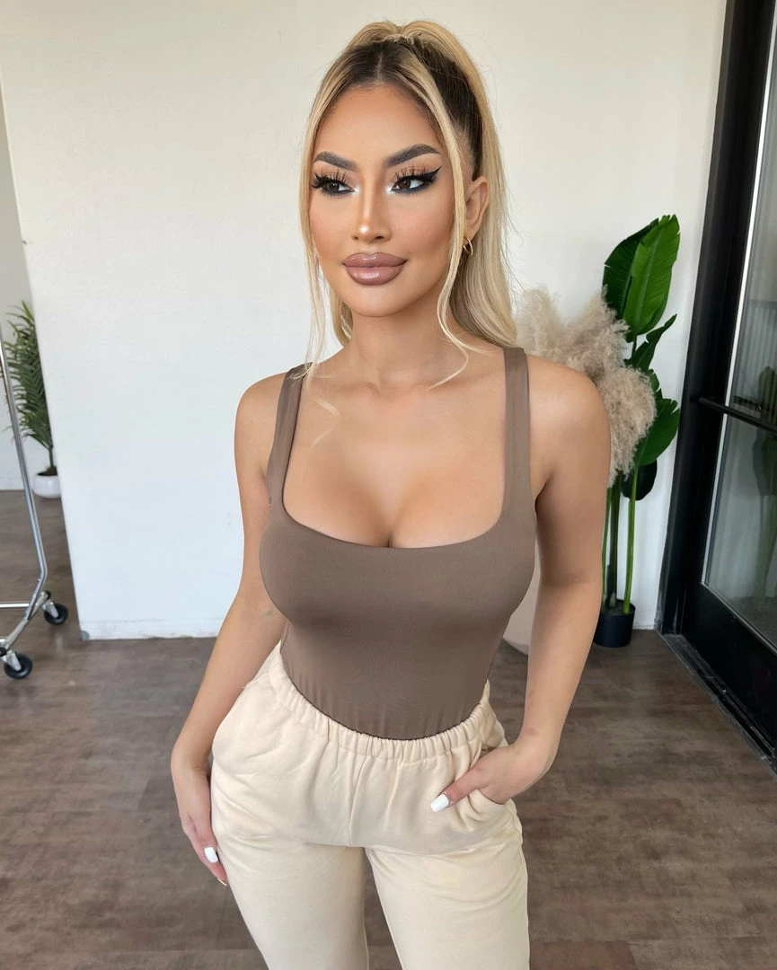 ~Tank bodysuit with nice front square cut, Goes perfect with many of our denim jeans and is available in 2 other colors