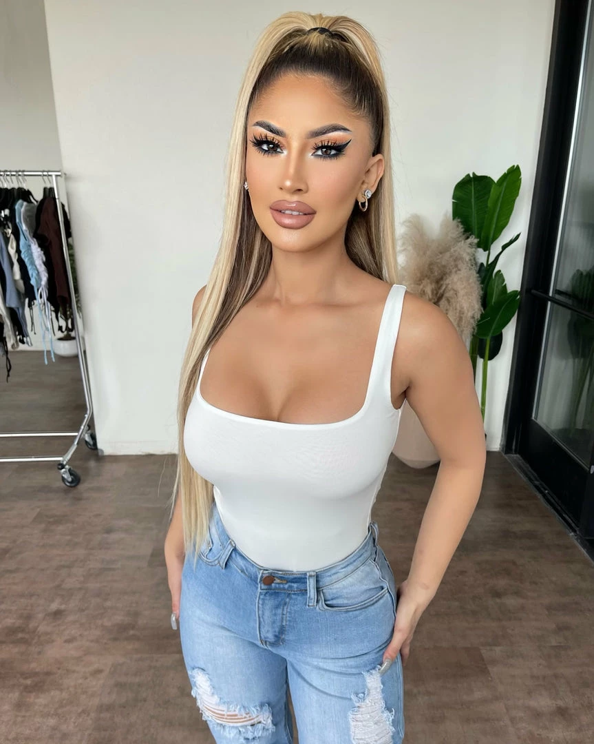 ~Tank bodysuit with nice front square cut, Goes perfect with many of our denim jeans and is available in 2 other colors