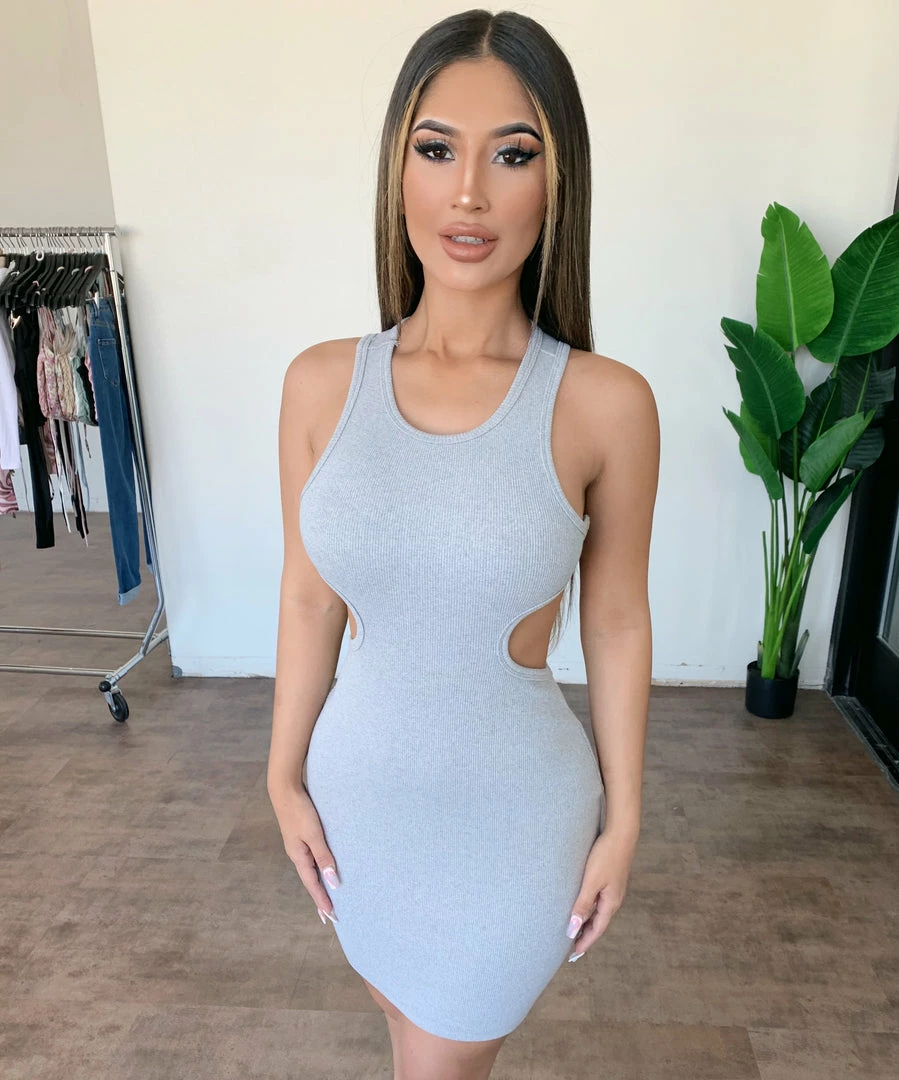 ~Dress made from fitted ribbed material with slit detail on bottom left of dress, Dress is perfect with a cropped jacket and great for a nice night or day out