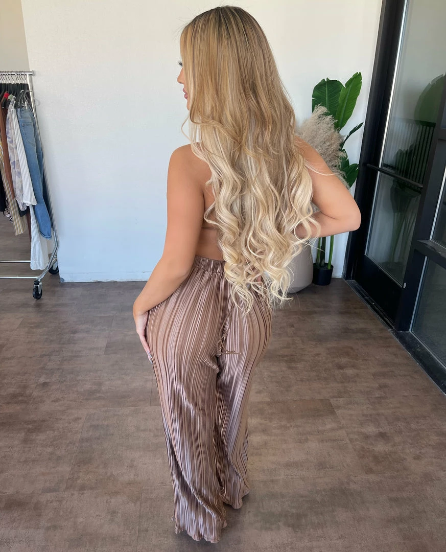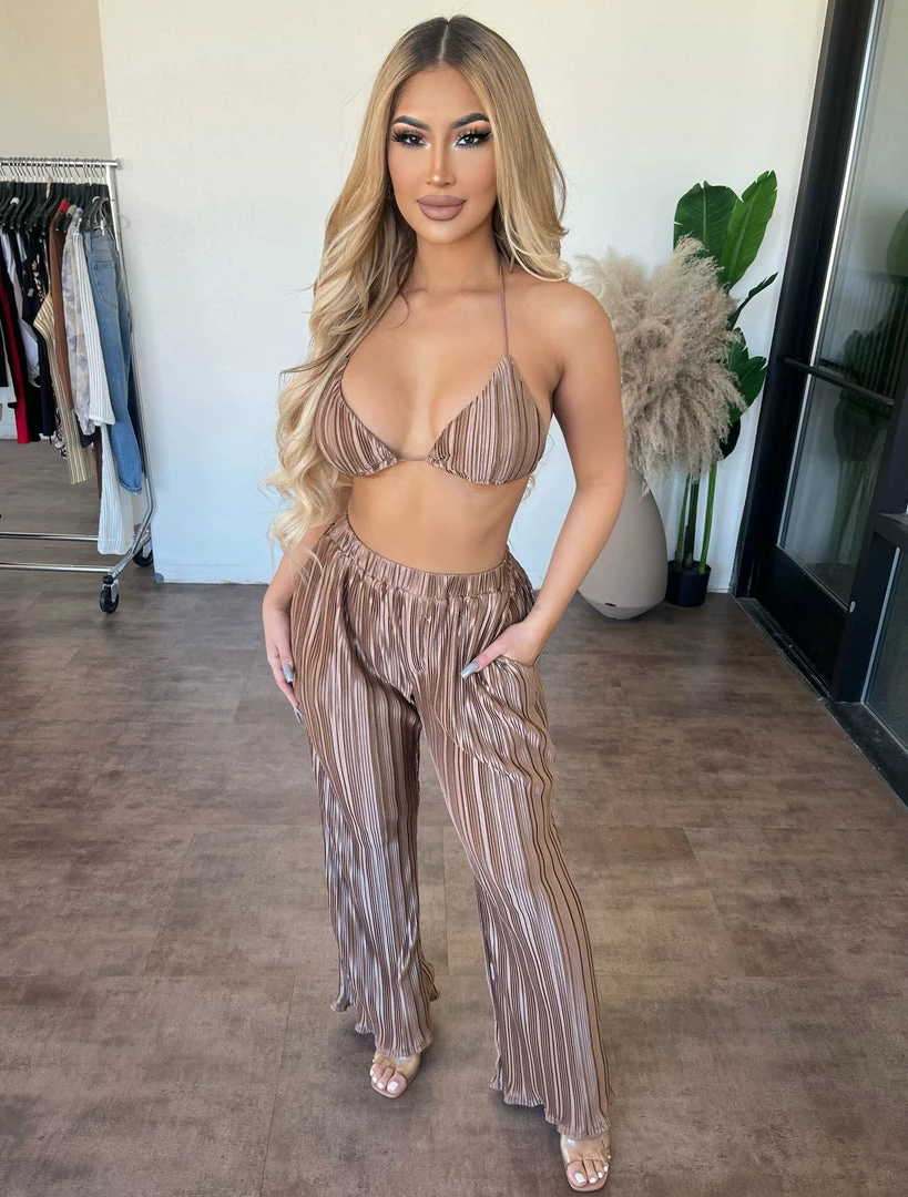 ~Set made from soft woven satin material, Set has a Bikini top that has adjustable tie string detail on the back and the bottoms are flare pants with pockets. set is perfect for a date night out or a special occasion.
