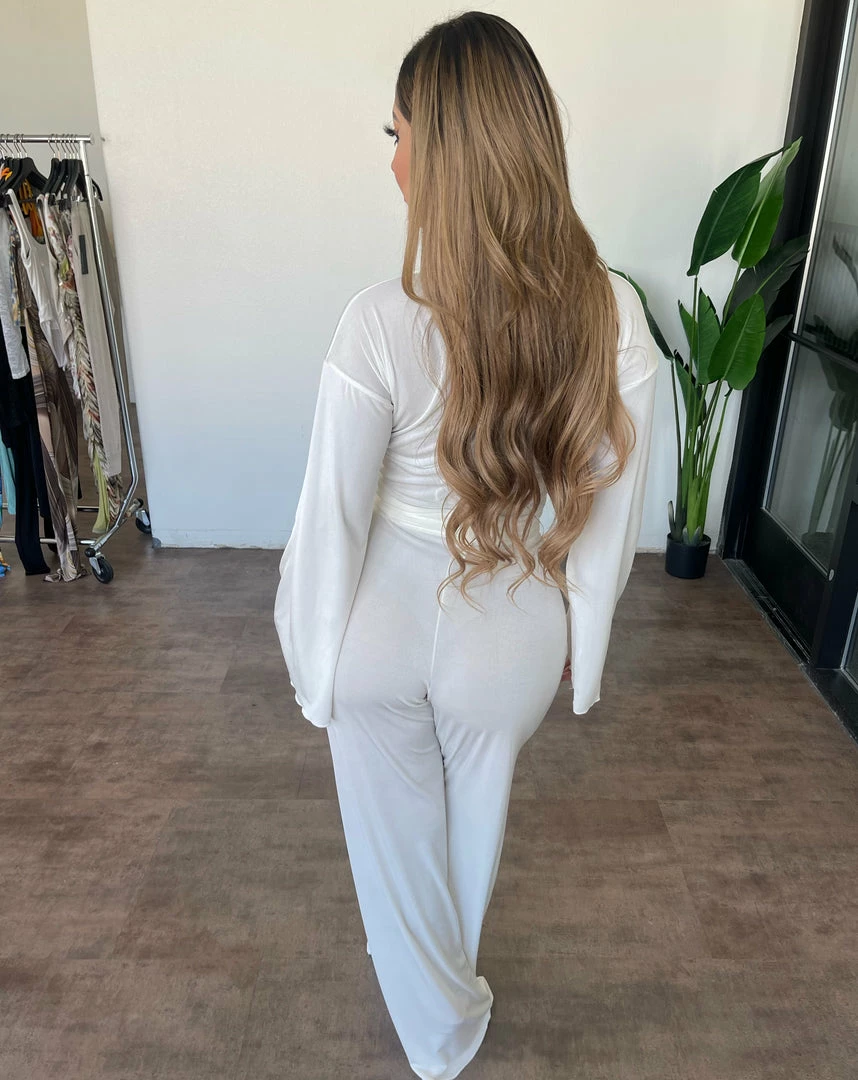 Beautiful Three Piece Set matching cardigan ,bikini top with wide leg pants.