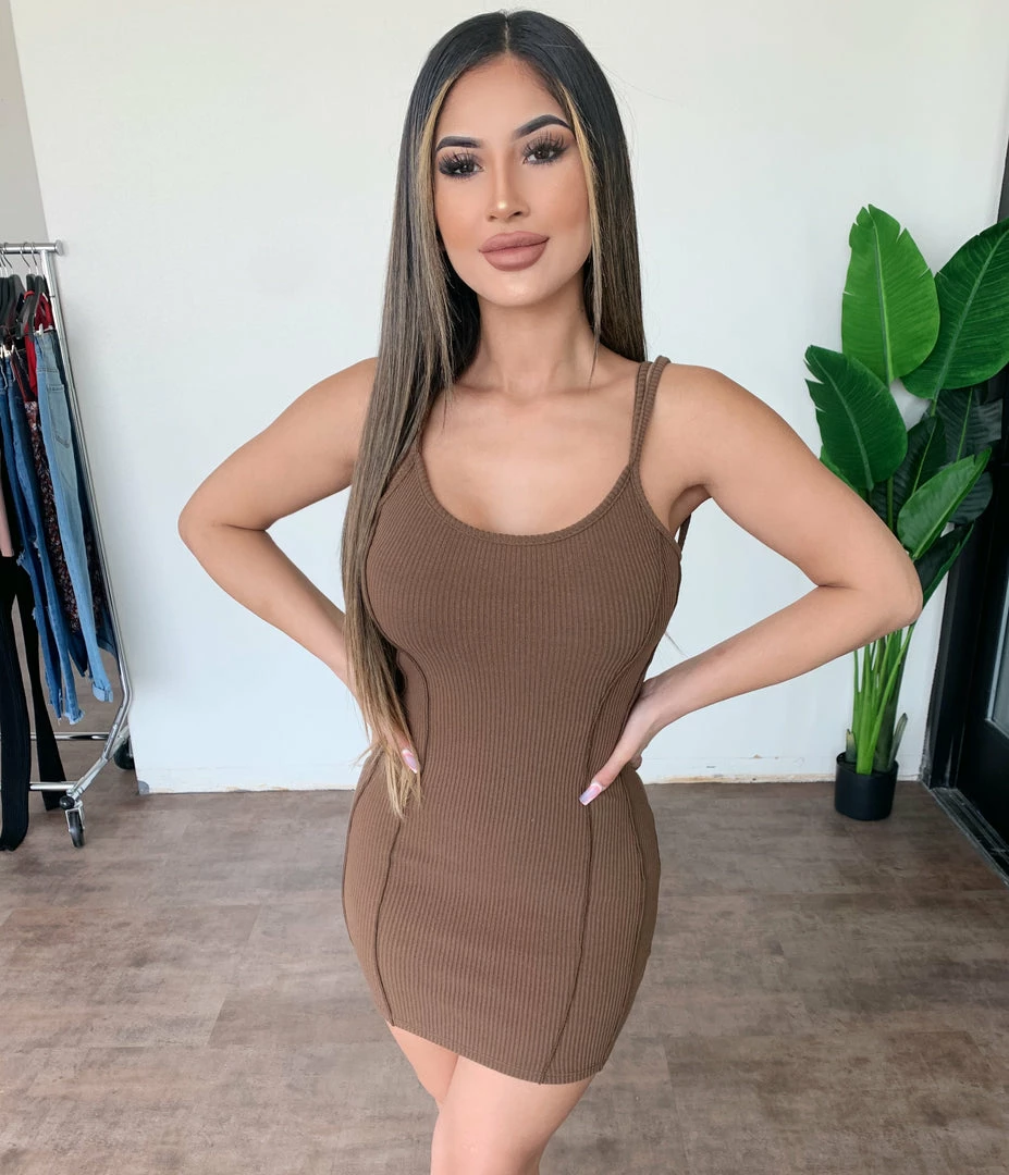 ~Dress made from fitted ribbed material with non-adjustable cami straps, Dress is great for a nice night out and perfect with a cropped denim jacket
