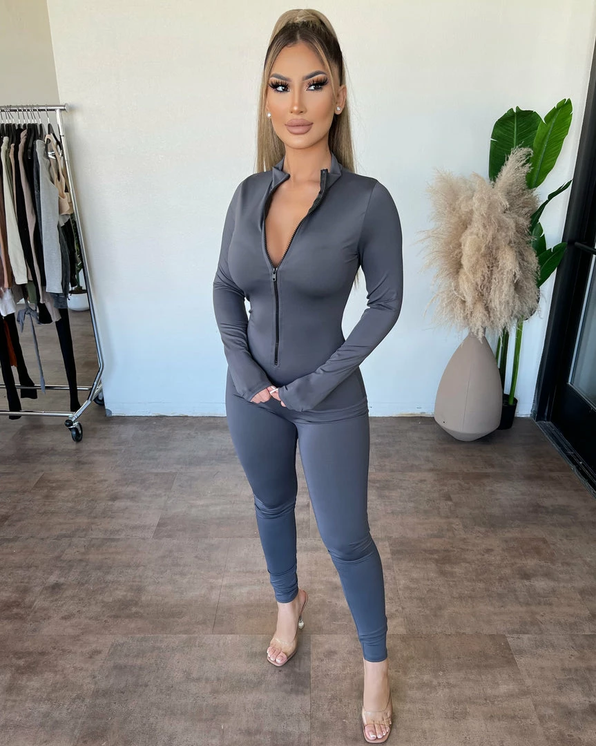 ~Long sleeve jumpsuit made from nice fitted material with adjustable front zipper detail, Jumpsuit goes great with heels or sneakers