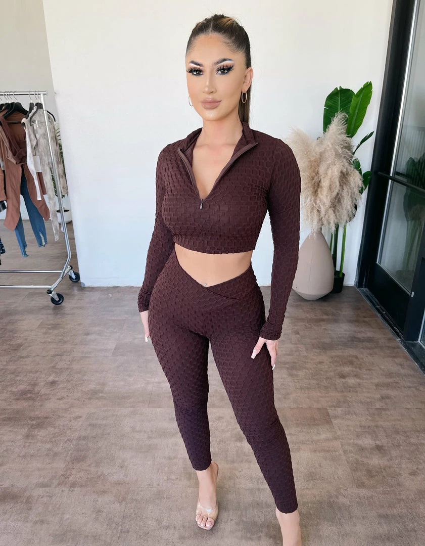 ~Matching set with leggings for the bottom and long sleeve zipper top, Set is made from nice stretching waffle material and has an adjustable front zipper detail