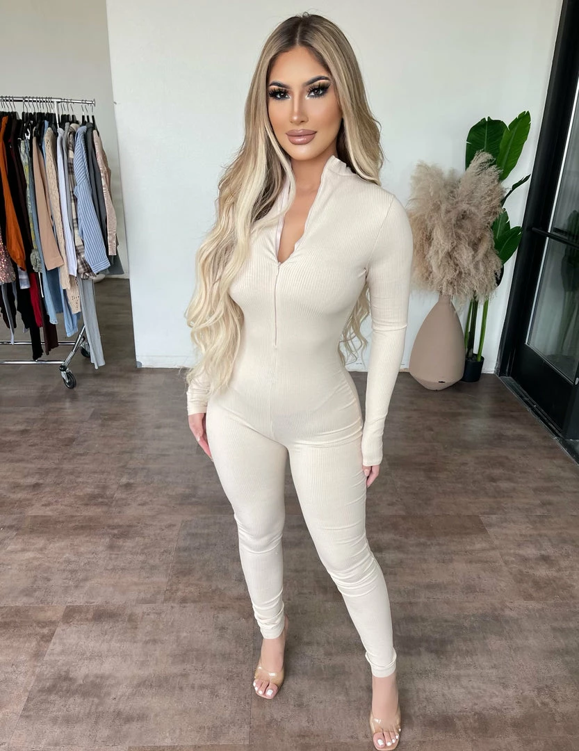 ~Long sleeve bodysuit made thick ribbed fitted material with adjustable front zipper detail, Jumpsuit is perfect with a cropped denim jacket and great for many occasions