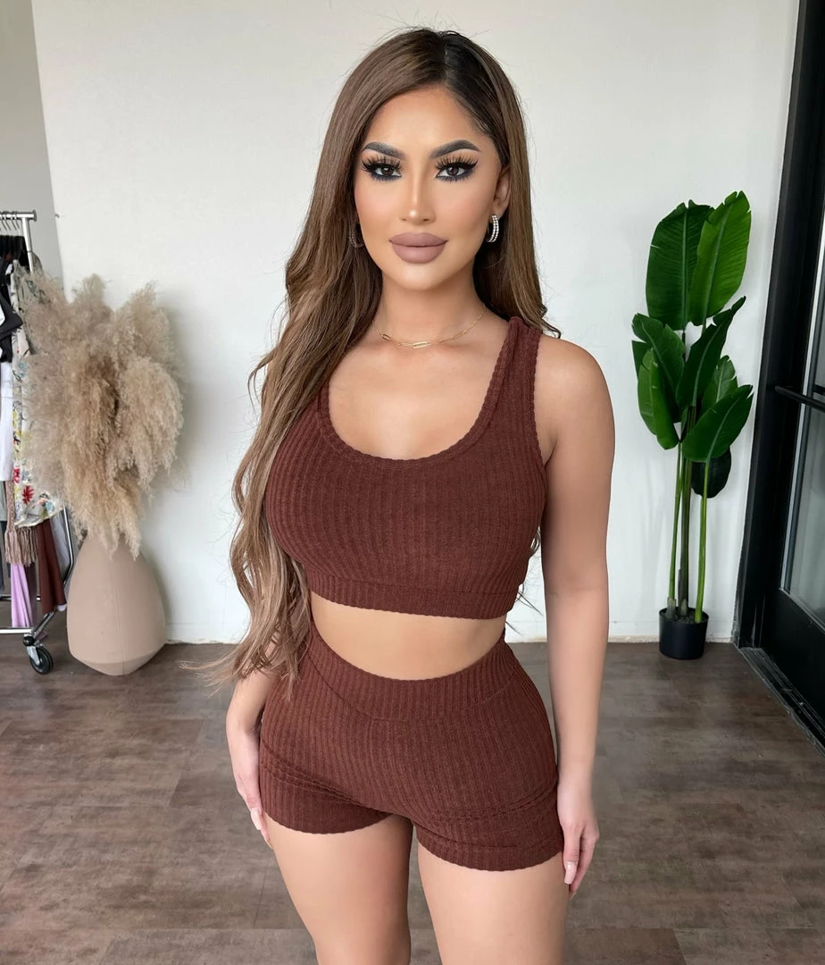 ~Matching set made from knit fitted material with tank top and shorts for bottoms, Set goes great with a cropped denim jacket and perfect with heels