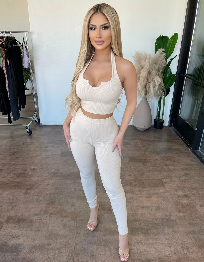 ~Set made from a nice ribbed material with ribbed halter top and pants for bottoms, Set is great for a nice night out and perfect with heels