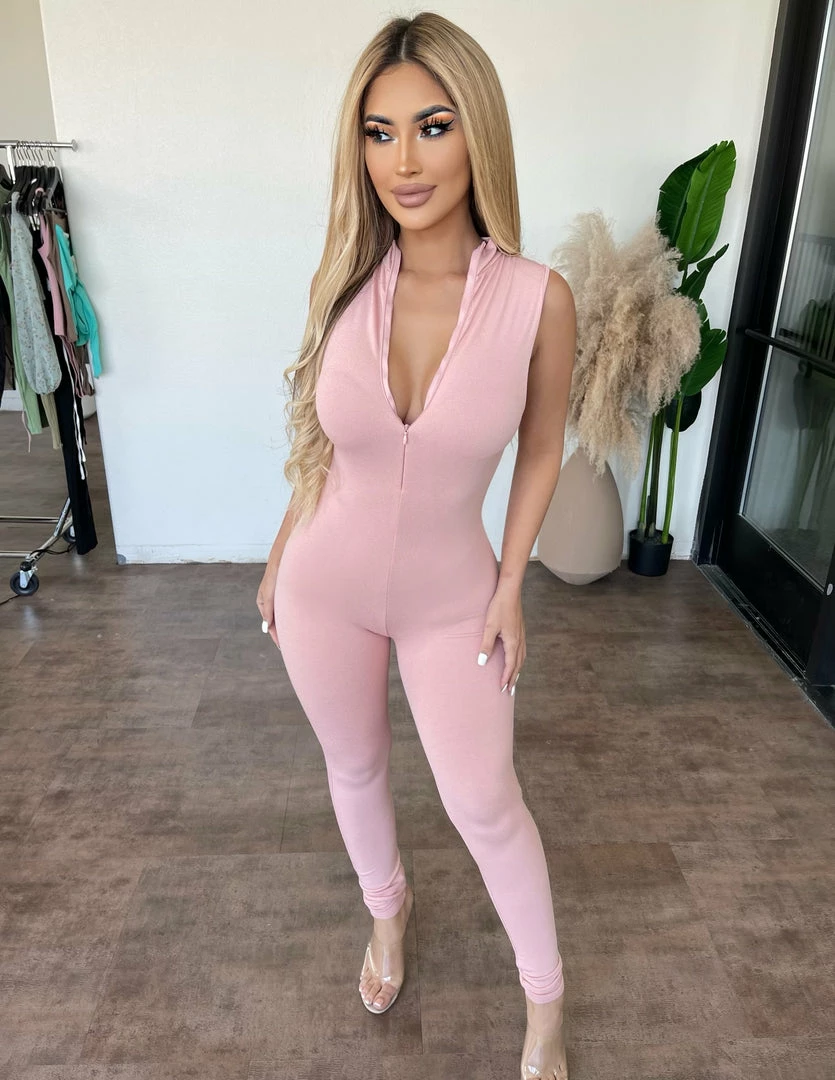 ~Jumpsuit made from nice fitted material with adjustable front zipper detail, Goes great with a cropped distressed denim jacket and heels