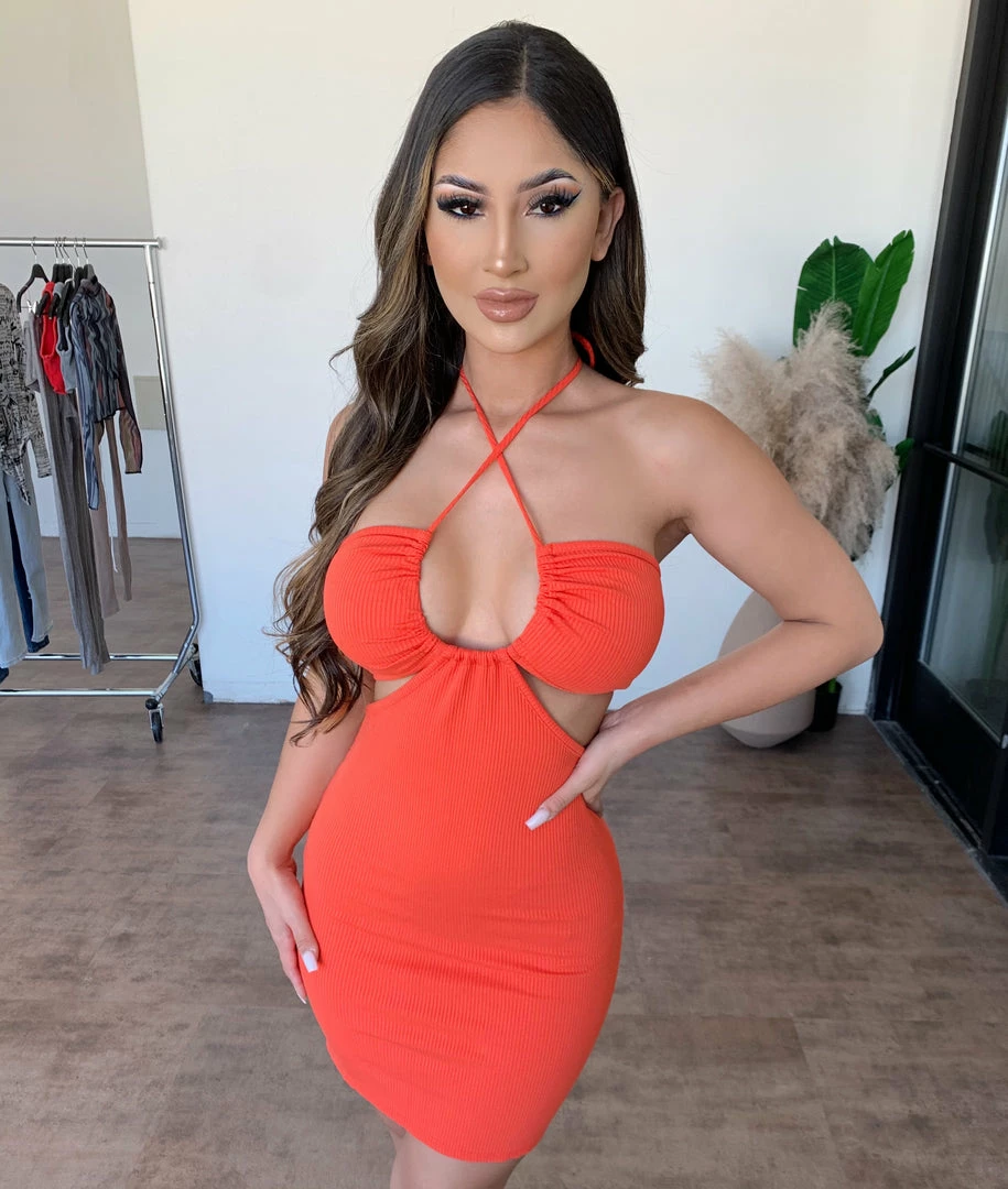 ~Dress made from a nice ribbed material with front chest detail, Dress also has nice open front stomach detail and goes great with heels
