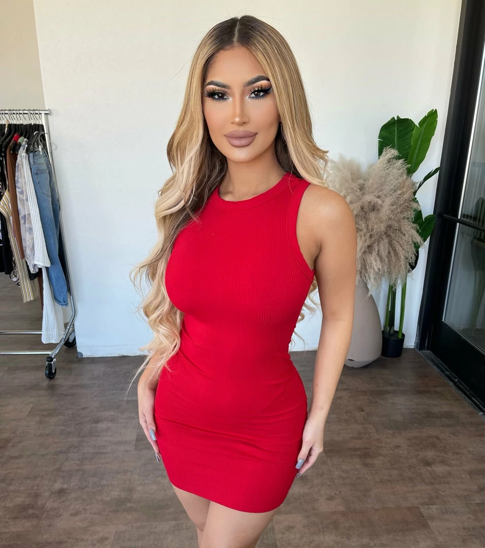 ~Dress made from nice ribbed material. The dress goes great with heels and is perfect with a nice cropped jacket
