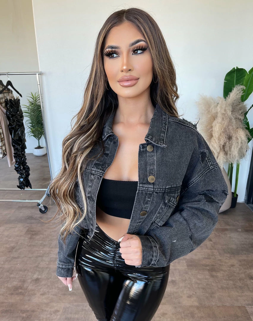 ~Jacket has multiple distressed details on front and back of jacket, Jacket also has adjustable front button detail