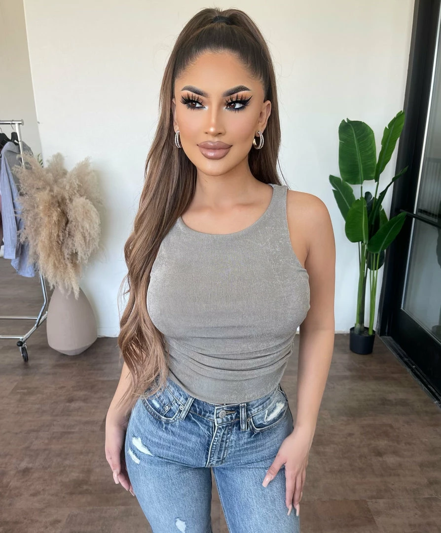 ~Top. made from semi stretchy material with faux side scrunch detail, Top goes great with distressed denim bottoms and perfect for a hot day out