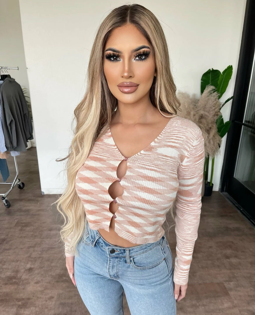 ~Cardigan made from nice ribbed material and has nice button and stripes for detail. The top also goes great with a pair of our denim jeans