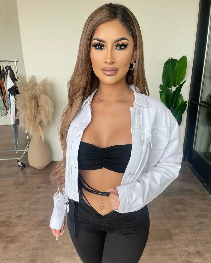 ~Denim jacket with chest pockets and adjustable waist drawstring detail, Jacket goes great with cami jumpsuit and is perfect for this cold weather
