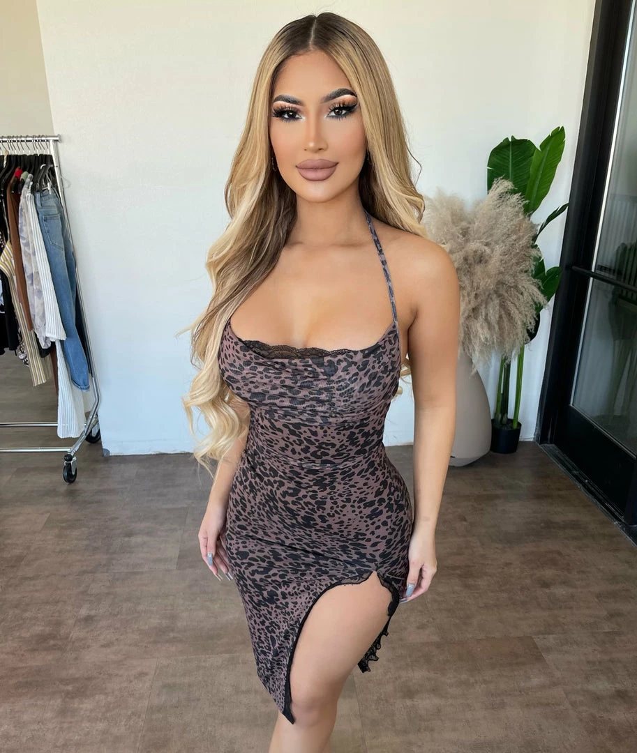 ~Halter dress made from nice mesh leopard print material, Dress has lace around the dress for great detail. The dress is perfect for a nice night out and goes perfect with heels.Â