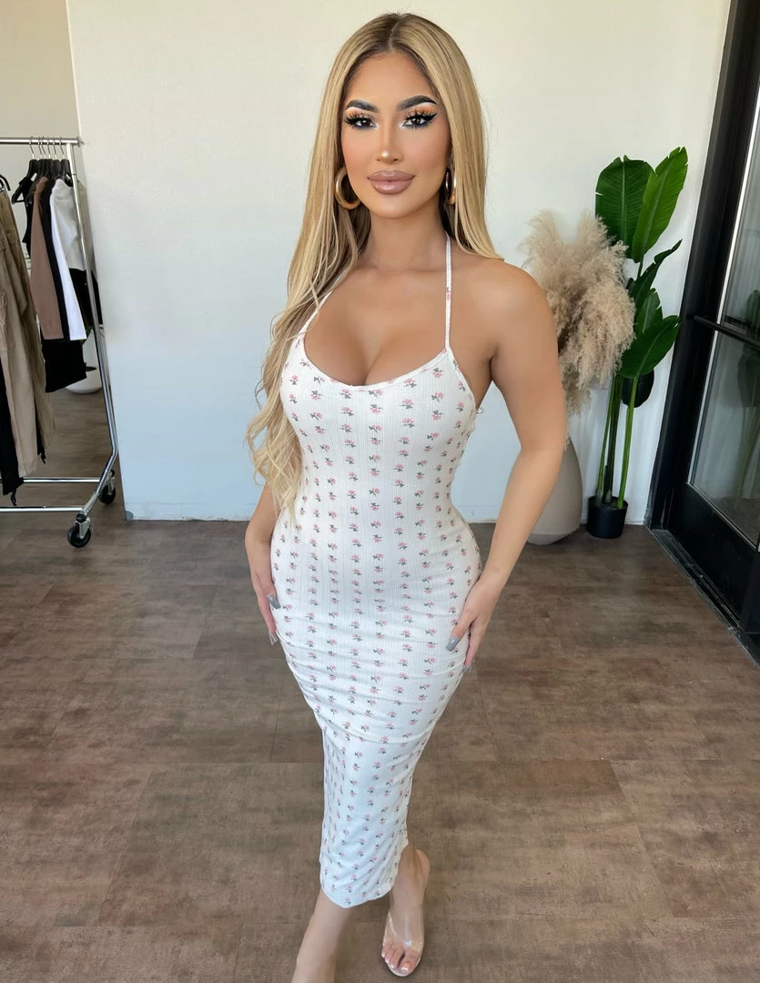 New Pink Dresses/Rompers Monica Halter Ribbed Floral Dress(White Pink Floral)