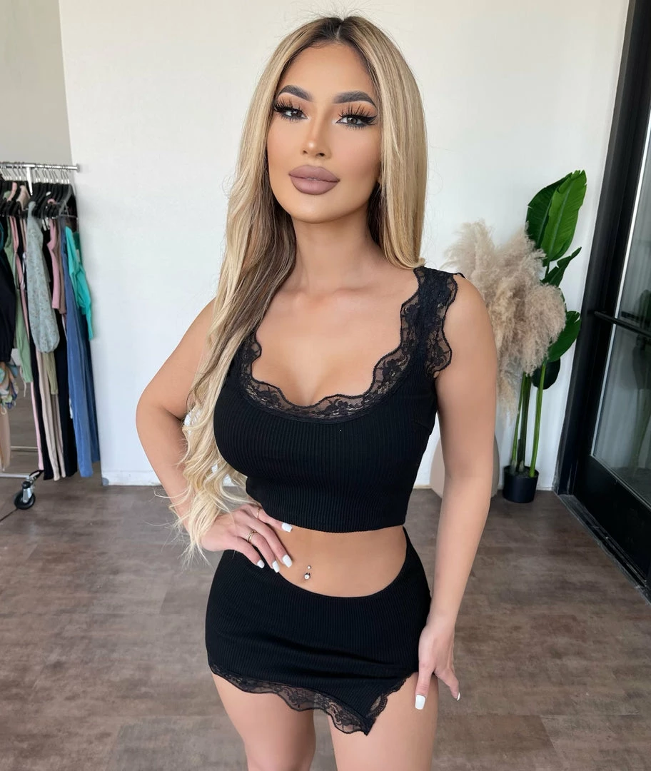 ~Matching made from nice ribbed material with lace detail on top and on skirt, Set goes great with a cropped jacket and perfect for many occasions