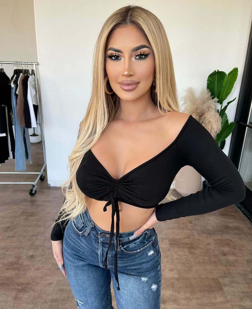 ~Long sleeve top made from nice soft ribbed material and has adjustable front drawstring detail, Top goes great with many bottoms