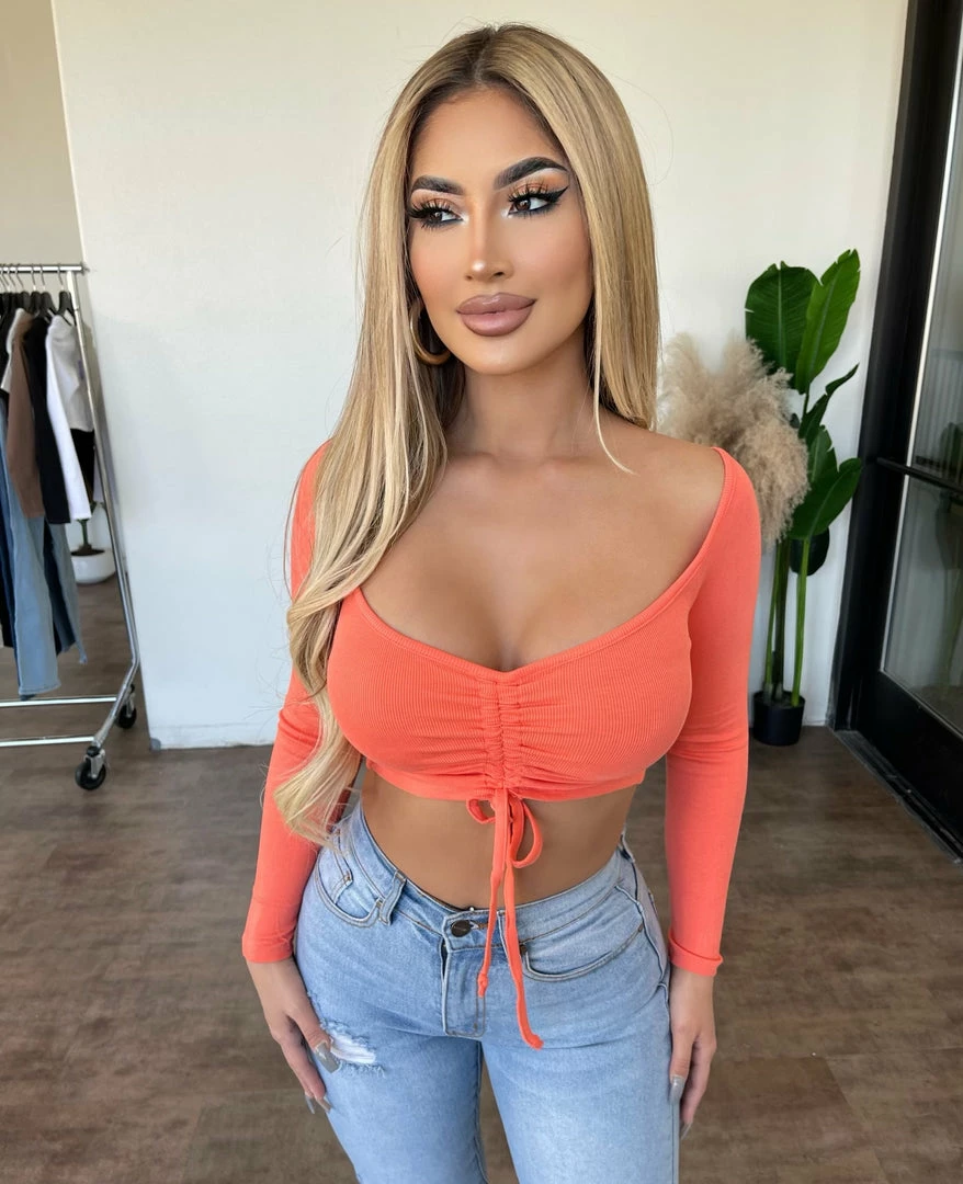 ~Long sleeve top made from nice soft ribbed material and has adjustable front drawstring detail, Top goes great with many bottoms