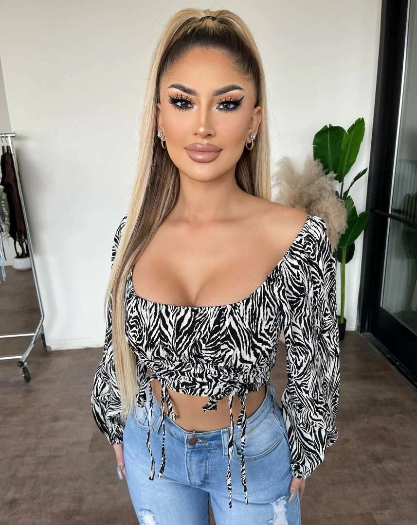 ~Long sleeve top made from nice printed material with adjustable front scrunch detail, Top goes great with many high rise bottoms and perfect for many occasions