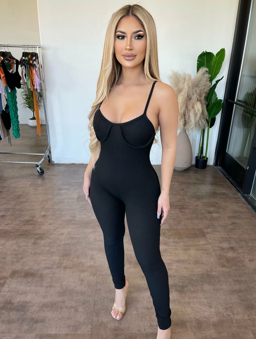 ~Cami jumpsuit made from nice ribbed material, Jumpsuit is great for many occasions like a nice night or day out and goes perfect with a cropped distressed denim jacket